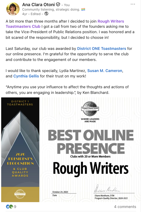 - Increase Rough Writers’ visibility internationally. One of my key accomplishments was pitching and securing a feature article in Toastmasters International magazine, which highlights clubs around the world.