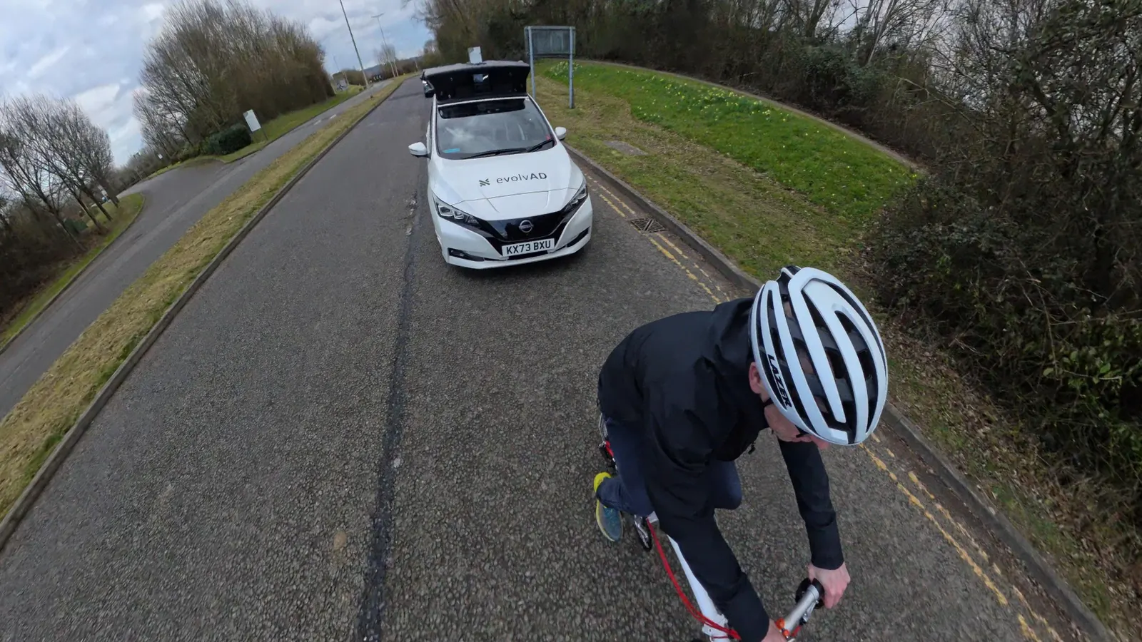However, I was in safe hands. Sort of. This driverless car—like others being tested in the U.K.—has a safety driver who must keep his hands close to the steering wheel should he need to regain control. I’d already told the driver what I would do, so it was no surprise to him when I jammed on my brakes and forced the Leaf to slow to a crawl behind me. In 2017, a previous version of the car skimmed a cyclist in London, leading to some bad press, so this latest iteration has been programmed not to overtake cyclists, horse riders, or anything slow-moving on the road. Instead, the safety driver is now charged with regaining control and executing the overtake, adhering to the Highway Code by giving as much room as would be required to overtake a car. The evolvAD can overtake cyclists, but the decision was made not to allow the car to travel in the oncoming lane, where a Highway-Code-compliant driver would have to go.