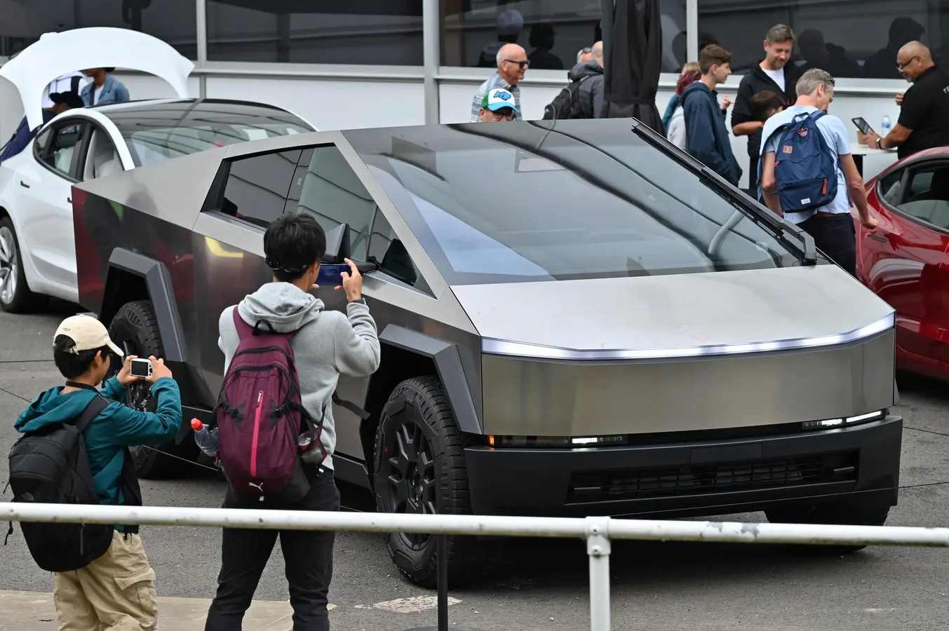 Visitors take photos of a Tesla Cybertruck during the British Motor Show 2024 at Farnborough ... [+] International Exhibition Centre on August 15, 2024 in Farnborough, England. (Photo by John Keeble/Getty Images)