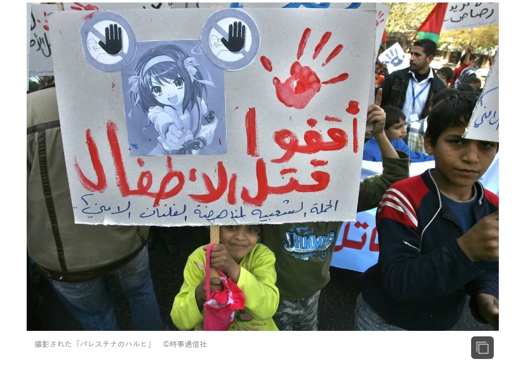 The "パレスチナのハルヒ/ Palestinian Haruhi” photo is a December 2006 photo taken by international french news outlet Agence France Presse (AFP) while covering a protest in the Gaza Strip. The outlet explained the demonstration was in response to the tensions between Fatah and Hamas at the time, and how 3 children were assassinated on December 11. Testimonies gathered by AFP explain the people feared a civil war, and how the deceased children’ classmates were even more shocked than usual, because their friends were not killed by israel as “usual”, but by other Palestinians. Either way, we should always look at the big picture and how none of this would happen without 70+ years of genocide, occupation and blockade by the israeli governments and their international allies.