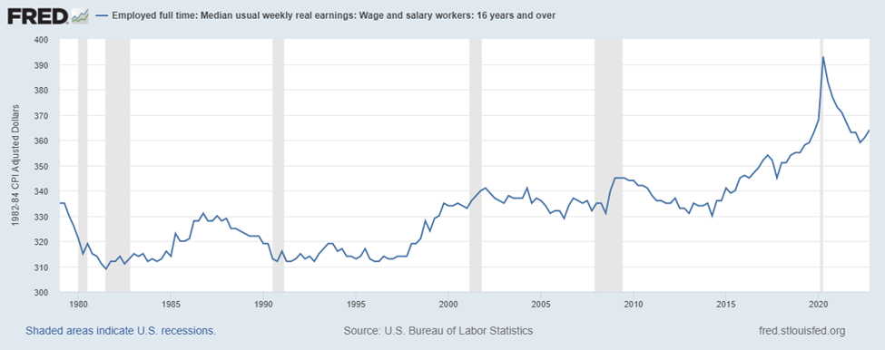 The list of ills troubling Americans in 2023 is astonishingly long and of a different kind altogether. But in strictly economic terms, it’s much harder to see what millions of Americans are so pessimistic about. U.S. unemployment is around record-low levels. Real earnings, while they’ve come down from the recent years’ pandemic-infused turbulence, are on par with pre-pandemic levels, noticeably higher than ever before.