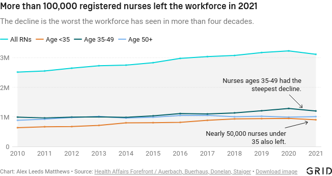 A more recent analysis that Buerhaus co-authored found that after those years of fairly steady growth, the supply of registered nurses declined by more than 100,000 in 2021, the largest single-year decline in more than 40 years.