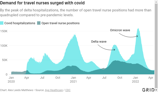 Before the pandemic, hospitals used travel nurse agencies to cover gaps created by staff nurses’ parental leave or summer vacations. But after covid hit, travel nurses became a vital tool to help hospitals cope with caring for waves of virus patients. As demand grew, so did the wages travel nurses could command — tempting many staff nurses to quit their jobs in favor of travel gigs.
