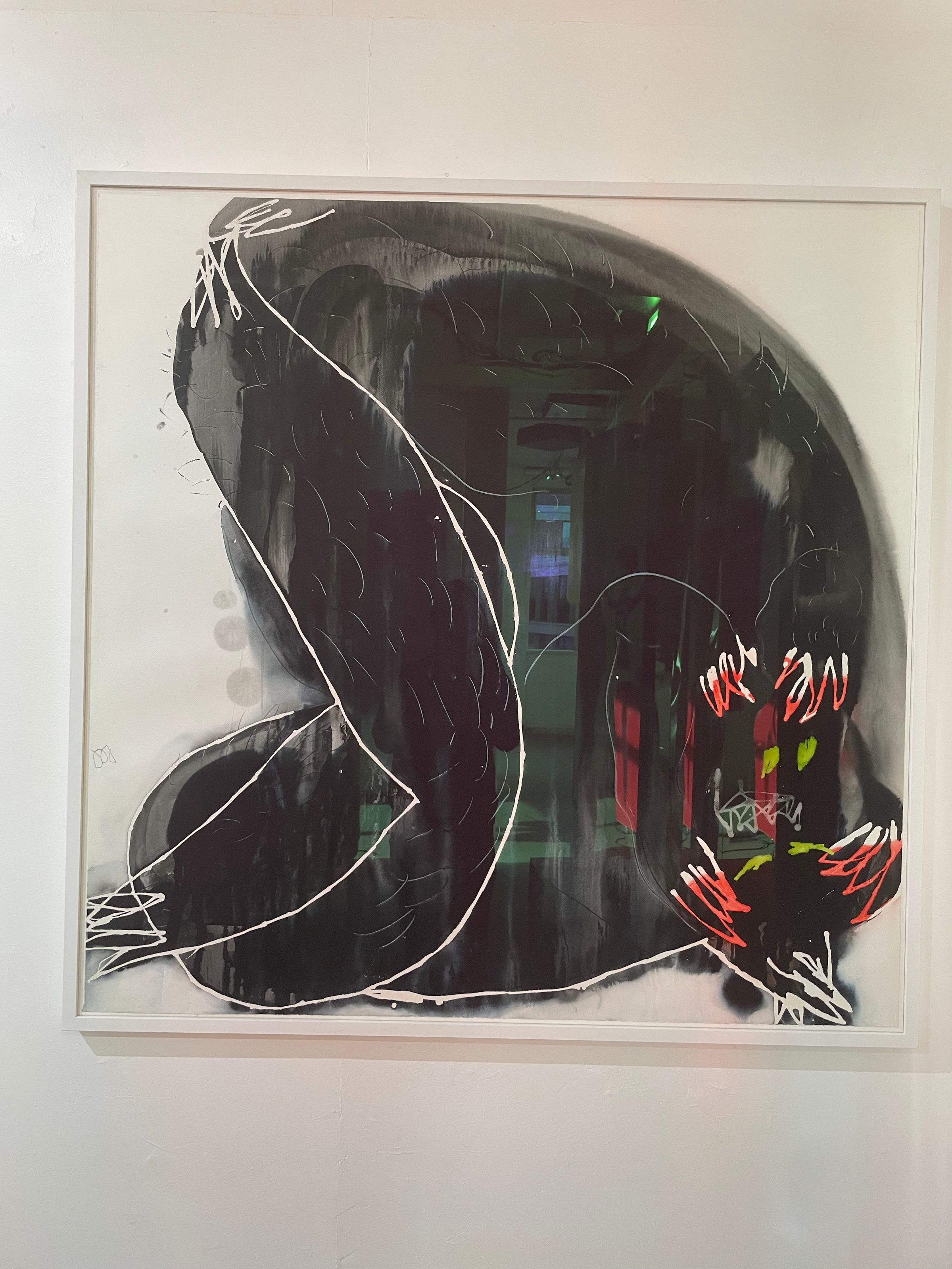 Paintings by Polina, one half of The Pomidor Group, are included in this show, hung on the back the walls of the space – abstract, darkly expressive they hint at beasts, hauntings, foreboding presence, devilish destruction.
