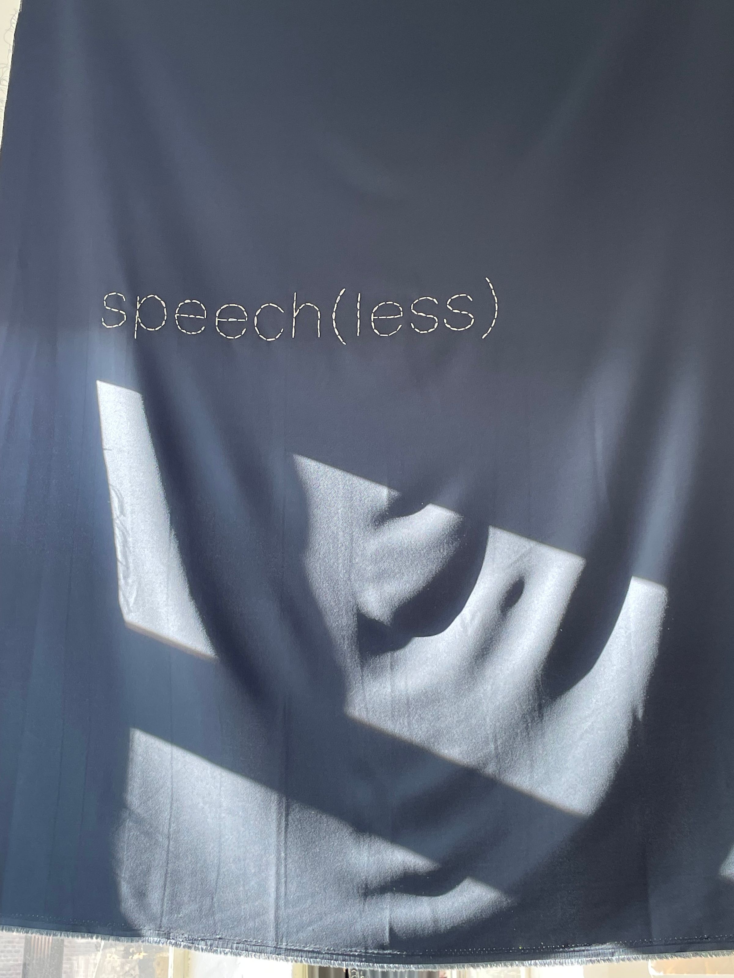 Sculpting an invisible architecture of pathways and soft, mobile walls of cloth, we move through the space like moving through the ghost of a building within a building (Not for Sale Gallery is on the 4th floor of what was probably once a factory space), echoes of destroyed space. I think of the bombings of buildings in Ukraine’s urban space, by the Russian army – or should I be saying “recently conscripted military personnel”?