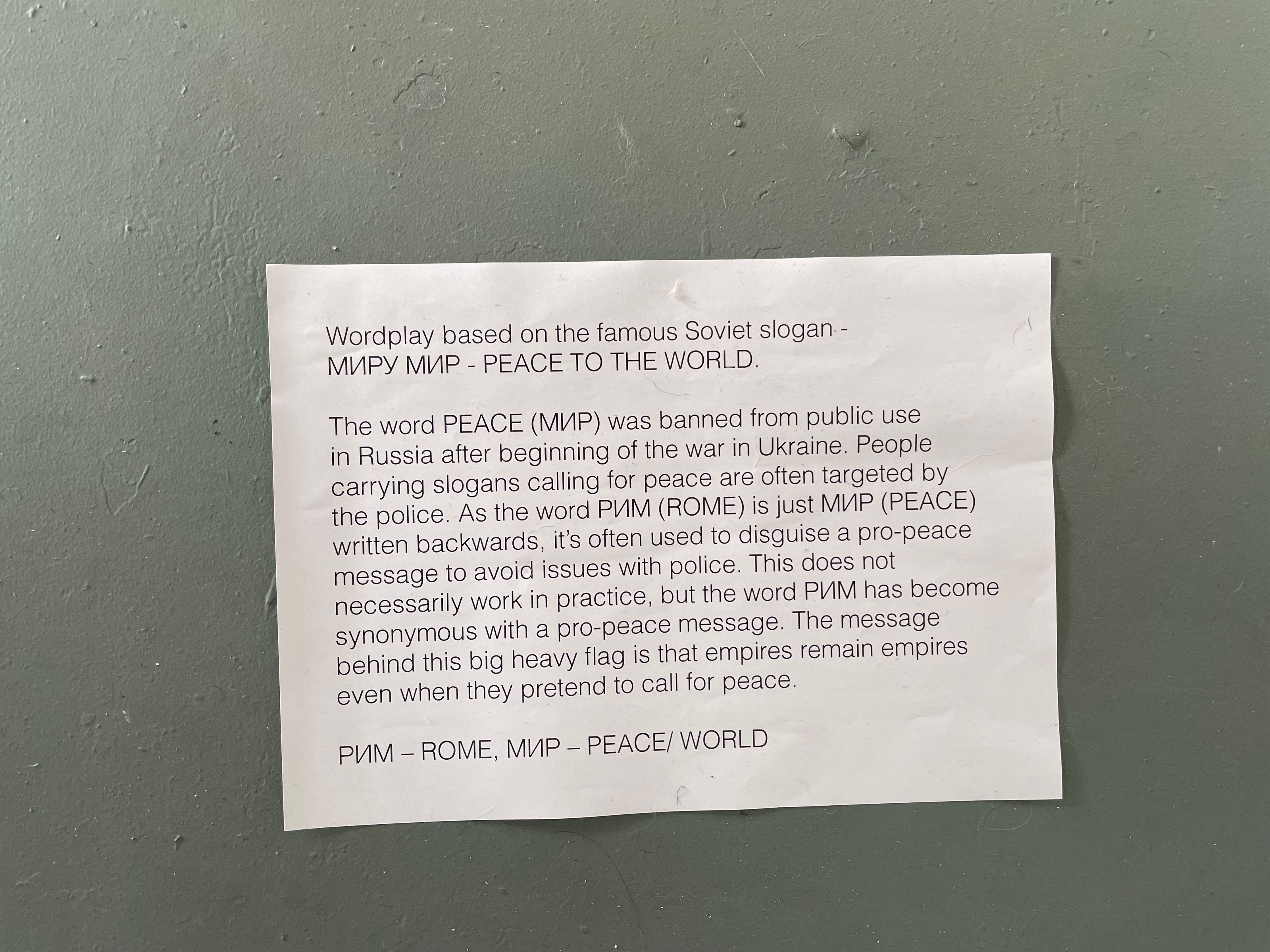 Russian words are subverted, re-played, re-purposed and re-shuffled as a means to escape the censors. Typographically that dangerous word PEACE is freed from Russian restrictions, it becomes ROME.