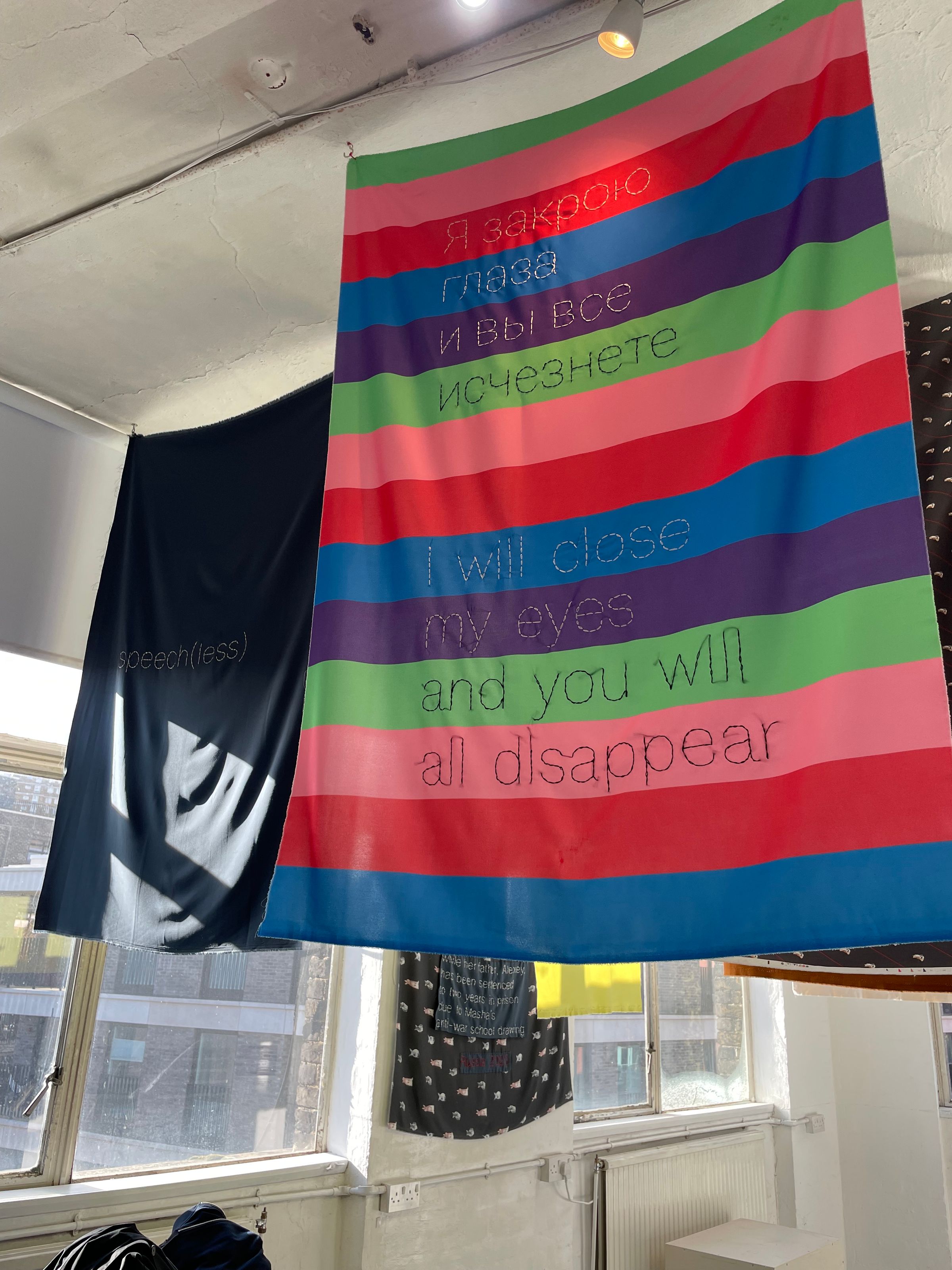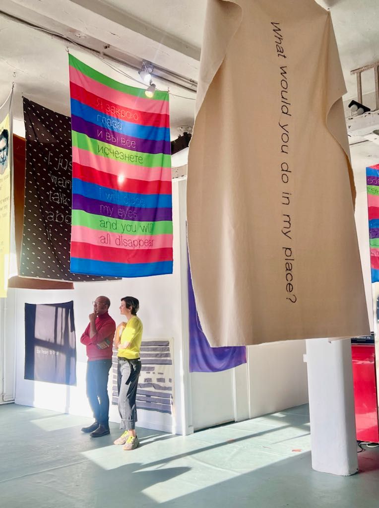 The Pomidor Art Group are two Russian women artists, Polina and Maria who lived and worked in Moscow until 2022, both currently live in London. Their exhibition at Not for Sale Gallery in Hackney Wick, London is a thought-provoking installation comprising words, phrases, quotes stitched on fabric and hung like flags or banners from the ceiling. Their work is a new iteration of a great tradition of what Rozkika Parker called “The Subversive Stitch”, a book published in…Nineteen Eighty-Four.