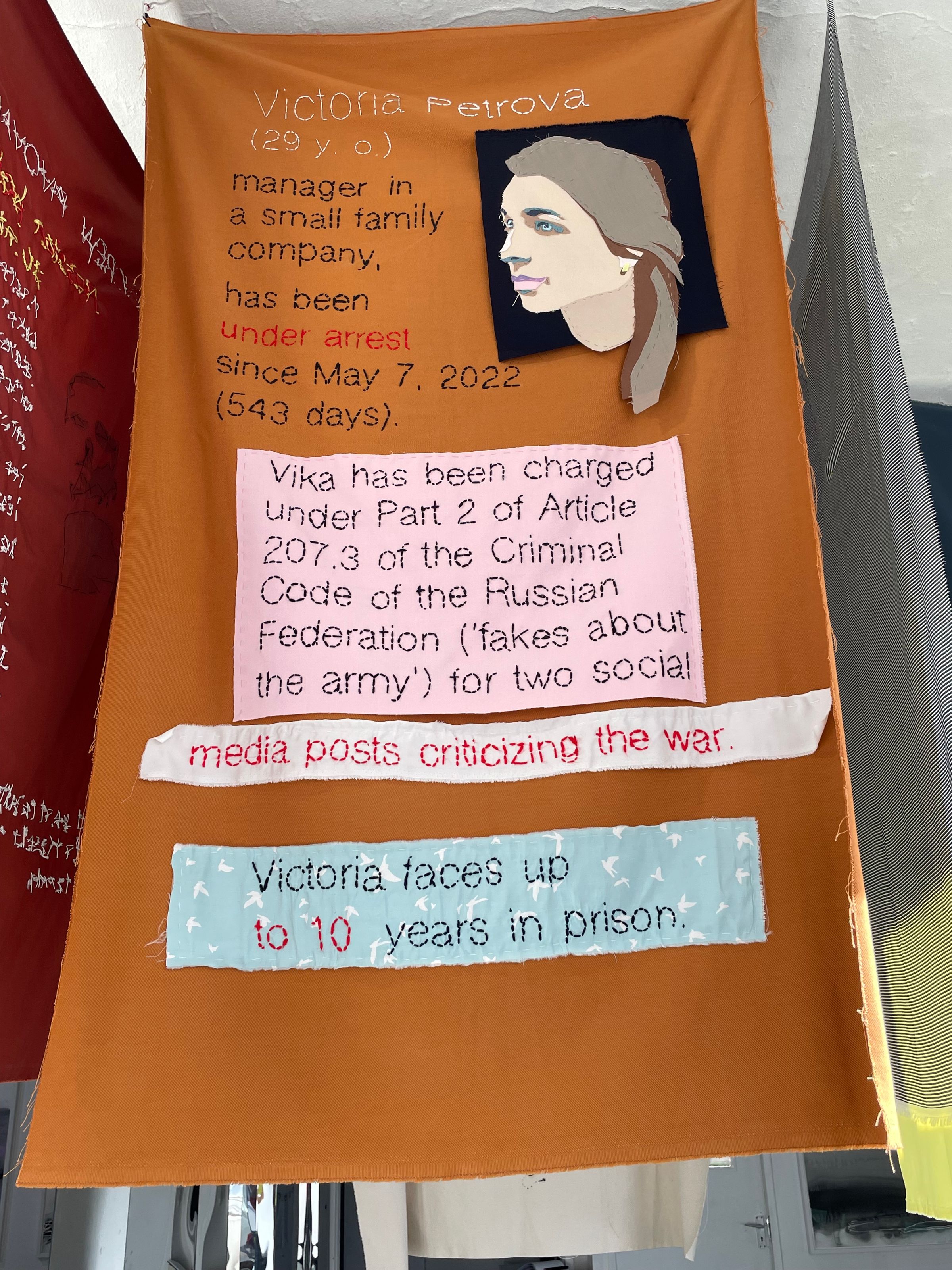 Poetic phrases haunt the space, balanced with banners embroidered with facts and portraits, news stories of Russian dissidents and activists who have been imprisoned, enemies of the state for criticising the Russian regime’s war on Ukraine. Some of these banners have hung outside of friends’ windows, probably not in Russia. The labour of the artists is not lost in making.