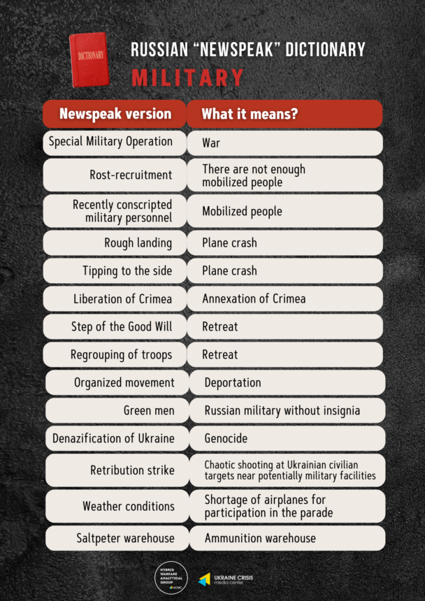 In Putin’s Russia, Orwellian Newspeak is a Kremlin propaganda strategy to alter the perception of its citizens; the Russian war on Ukraine is not a war, it’s “the special military operation” (source: Ukraine Crisis Media Center, Russian “Newspeak” dictionary, July 2023).