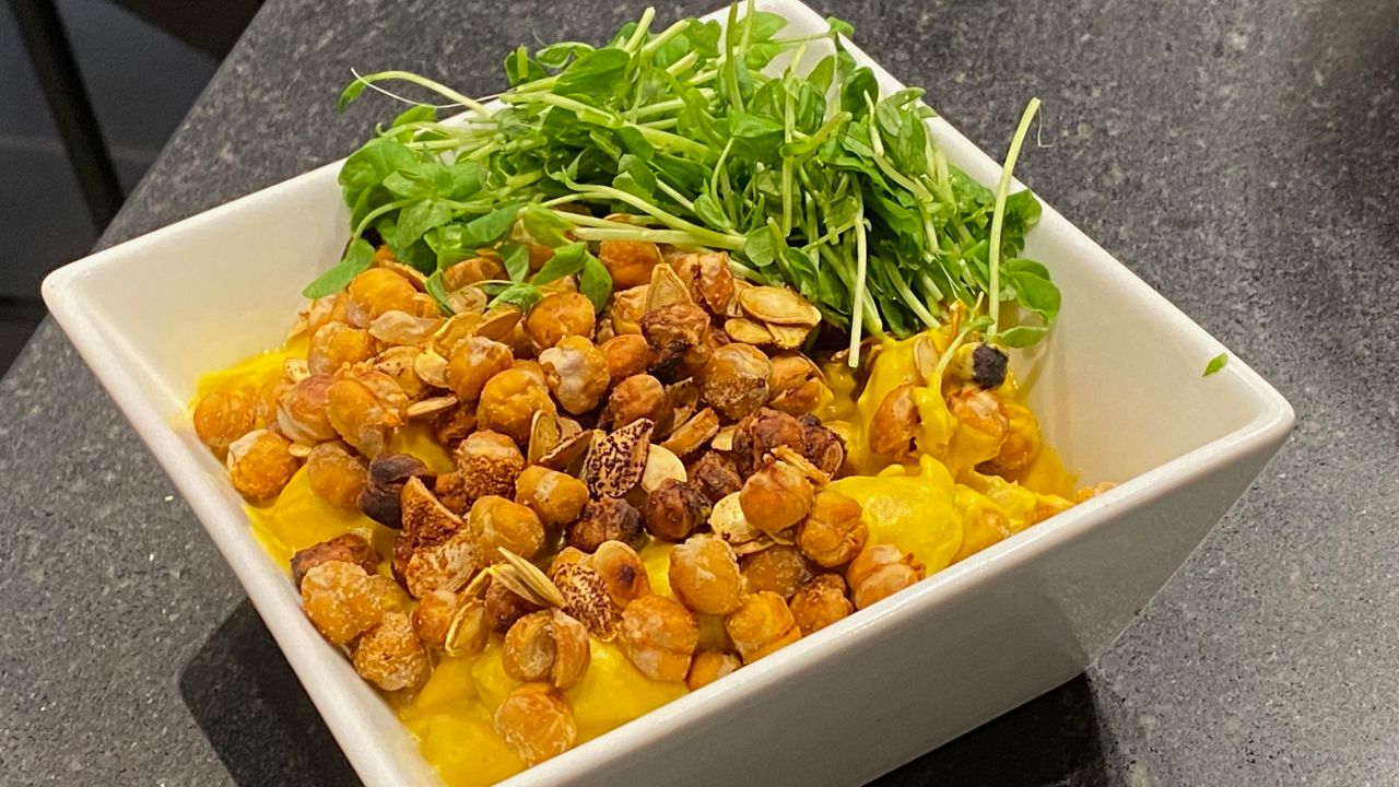 As a pot of water heats to a boil, Holland covers the healthy ingredients she’s brought: roasted chickpeas for texture, unbleached garlic powder, and roasted butternut squash — the “secret ingredient” in her sauce. She describes them in detail, and goes over each step in the process for those who will subscribe to the online courses for “Redefining Soul Food,” explaining why she prefers certain brands and techniques.