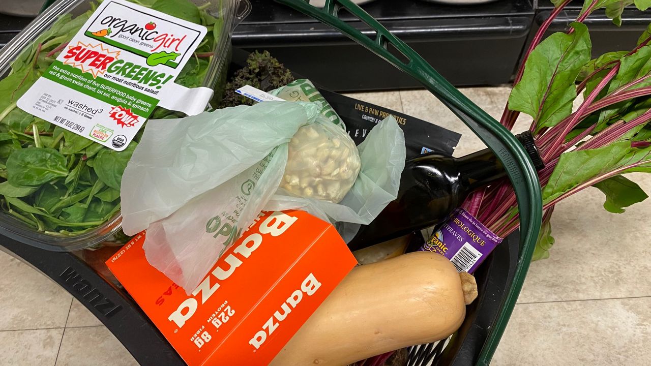 She grabs a bottle of organic salad dressing from the shelf, pointing out its very short and pointedly chemical-free list of ingredients (“the first four are what it’s mainly made of”), then stoops to scoop some nutritional yeast into a compostable baggie, saying its cheesy flavor will replace, well, cheese in her recipe. She opts for chickpea pasta rather than the usual grain-derived variety, as well.