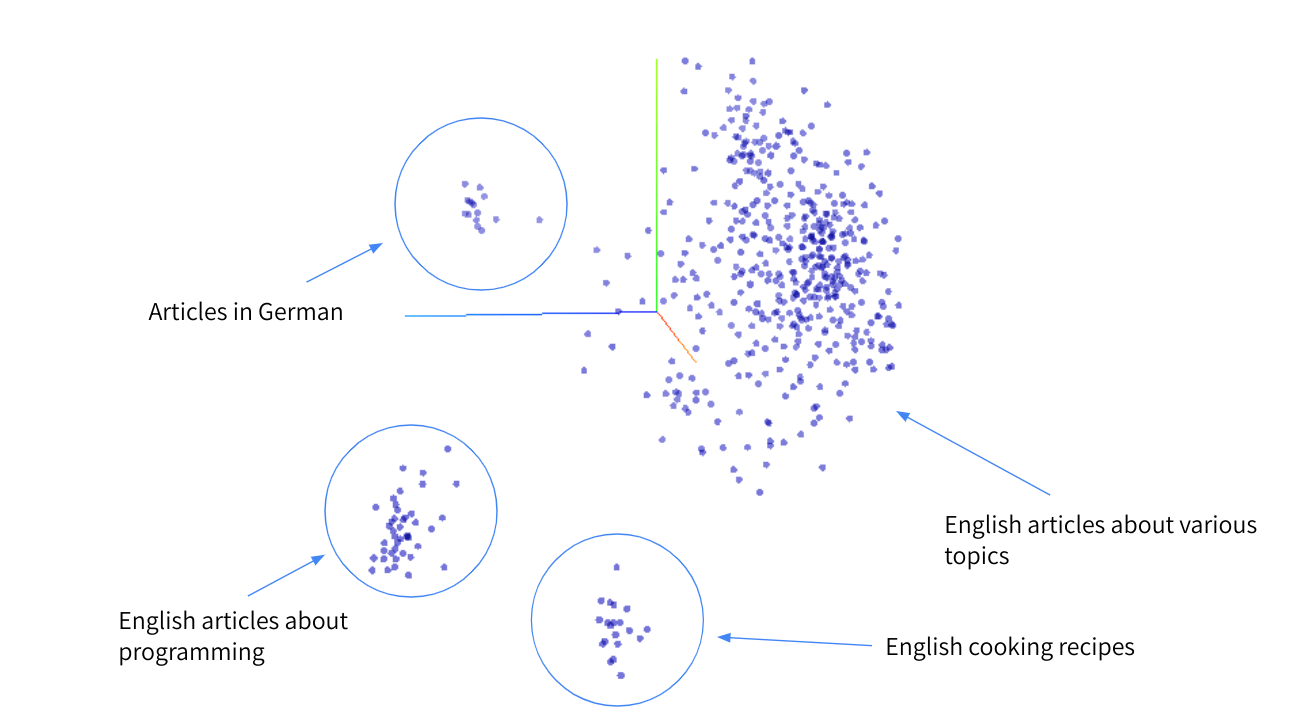 In the image, you’ll see that long-form pieces on different topics are in separate clusters. One contains articles about programming (in English), while another contains articles in German and one more contains articles about recipes (in English).