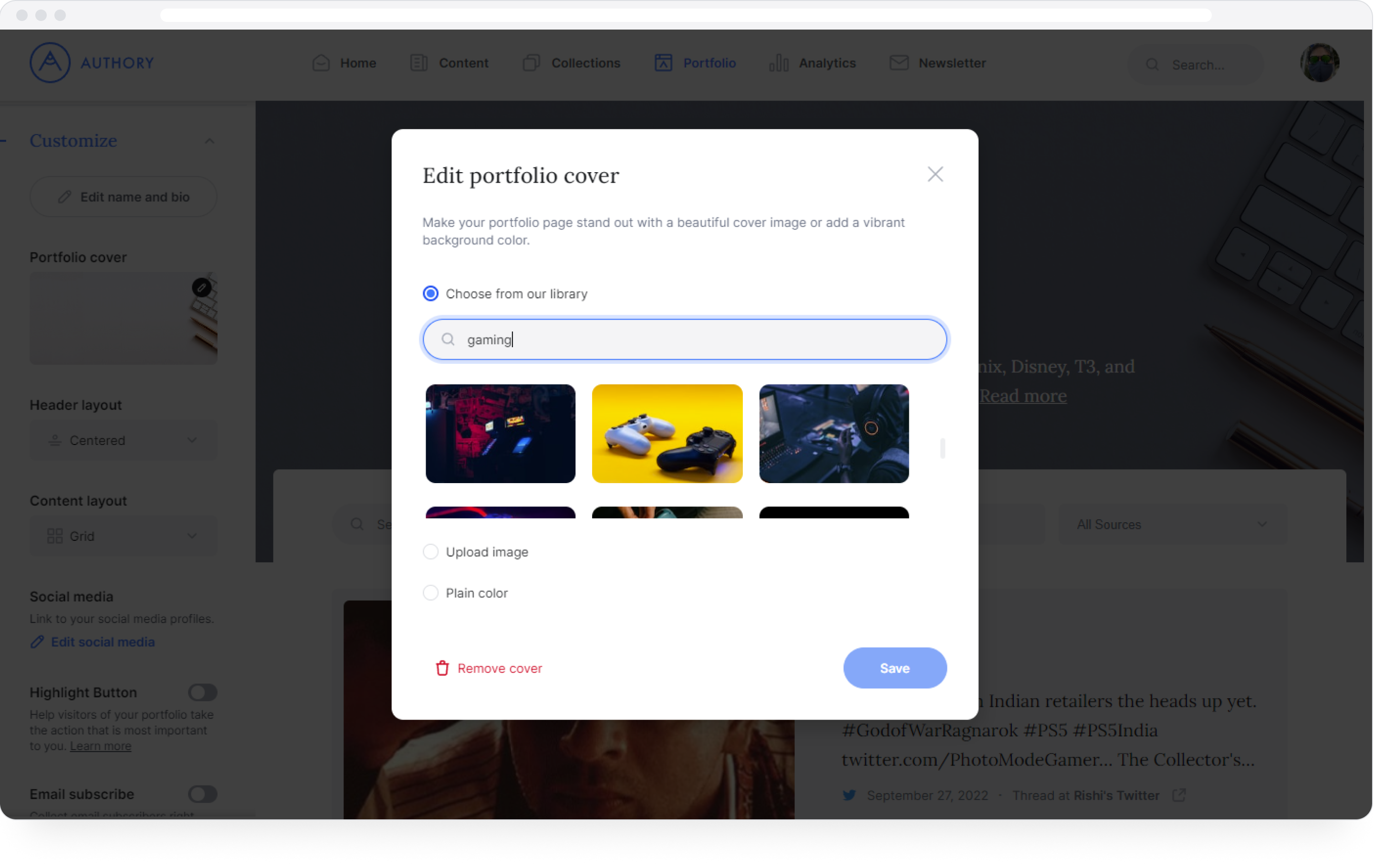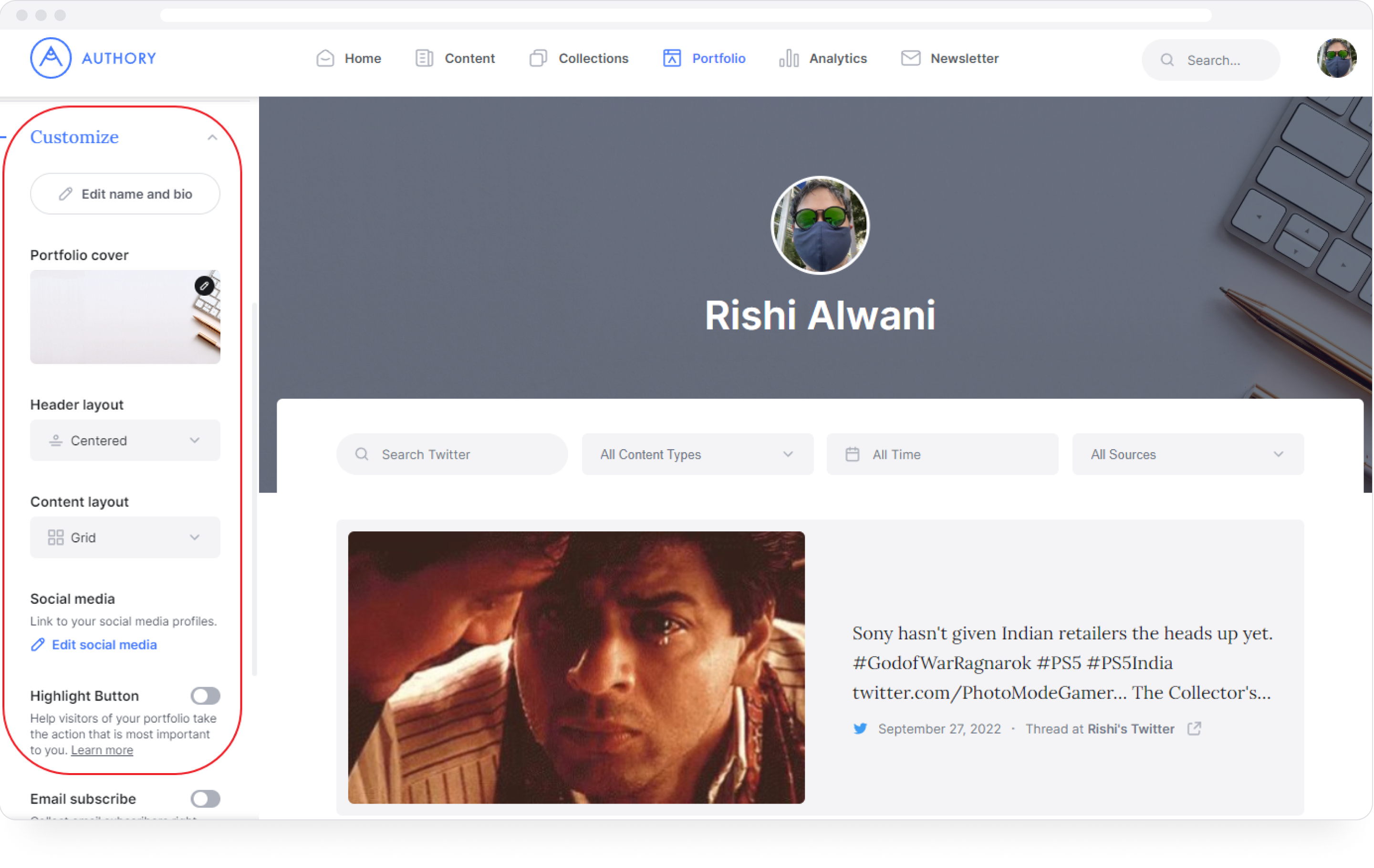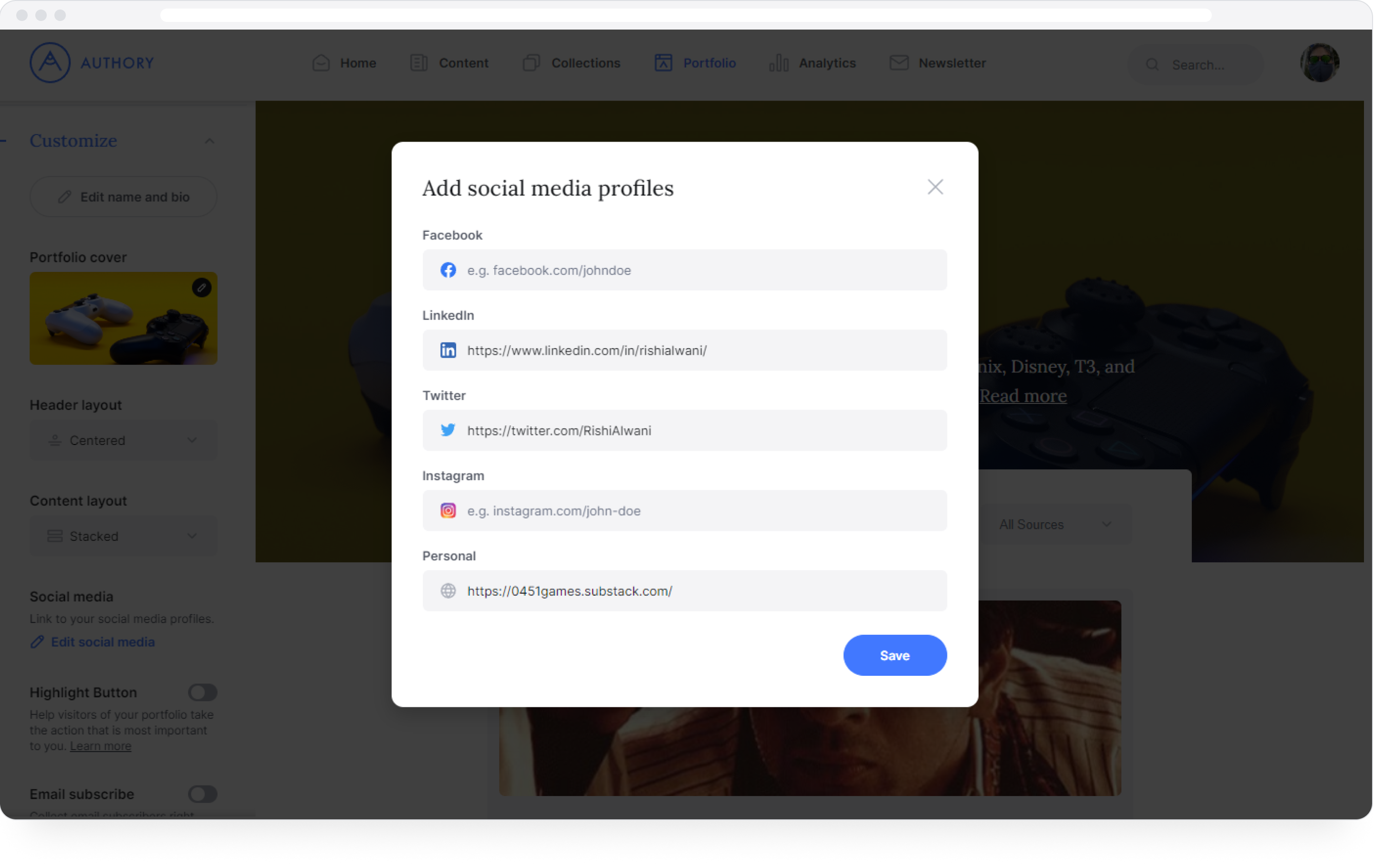 To set up a portfolio, use a portfolio builder like Authory. Simply add your social media accounts and any other website sources, and Authory will find all your content and import it into your account. Then build collections and connect these to your portfolio. Work on your "About" section, customize your portfolio's look and feel, and then you can share it with prospects.