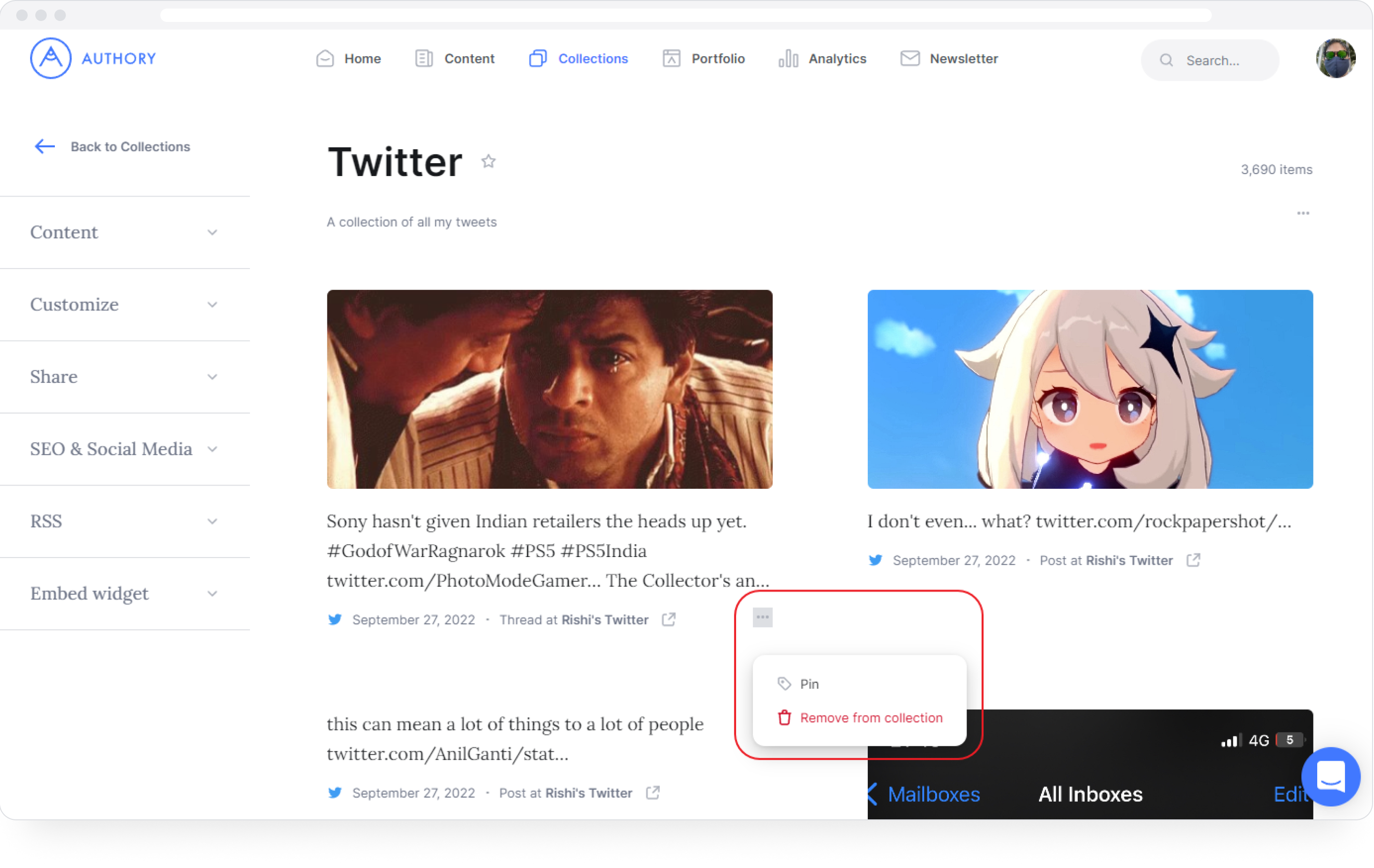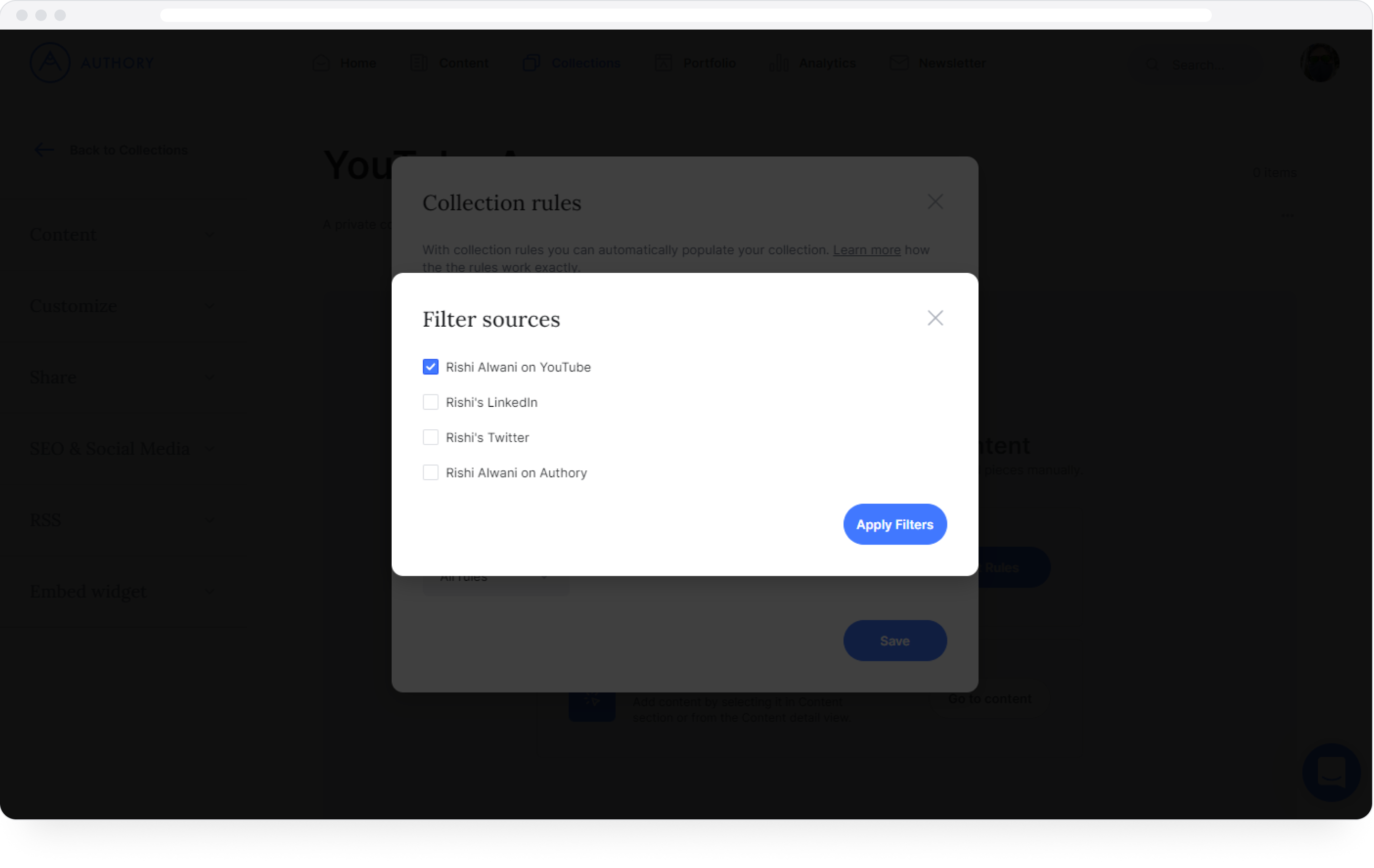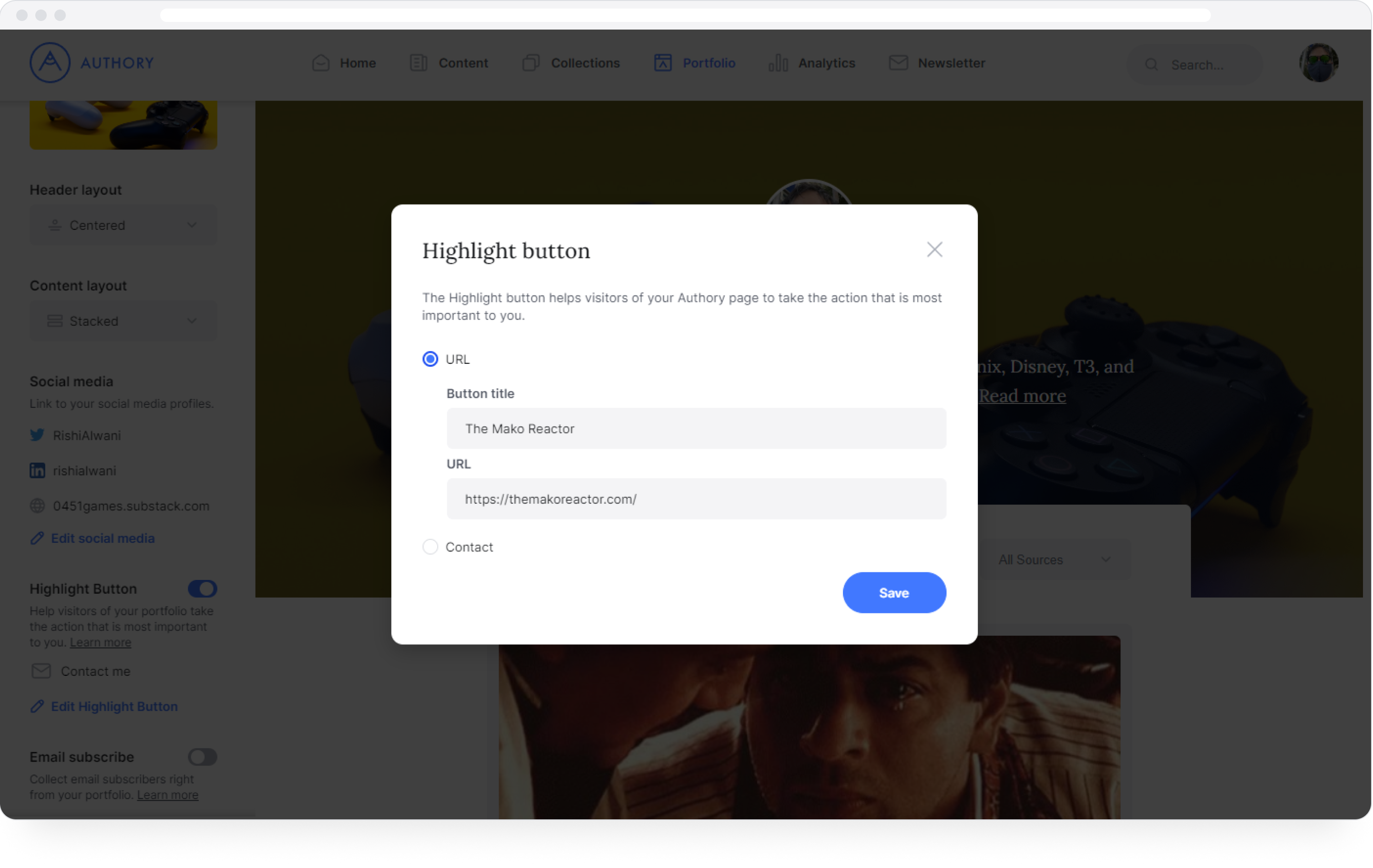To set up a portfolio, use a portfolio builder like Authory. Simply add your social media accounts and any other website sources, and Authory will find all your content and import it into your account. Then build collections and connect these to your portfolio. Work on your "About" section, customize your portfolio's look and feel, and then you can share it with prospects.