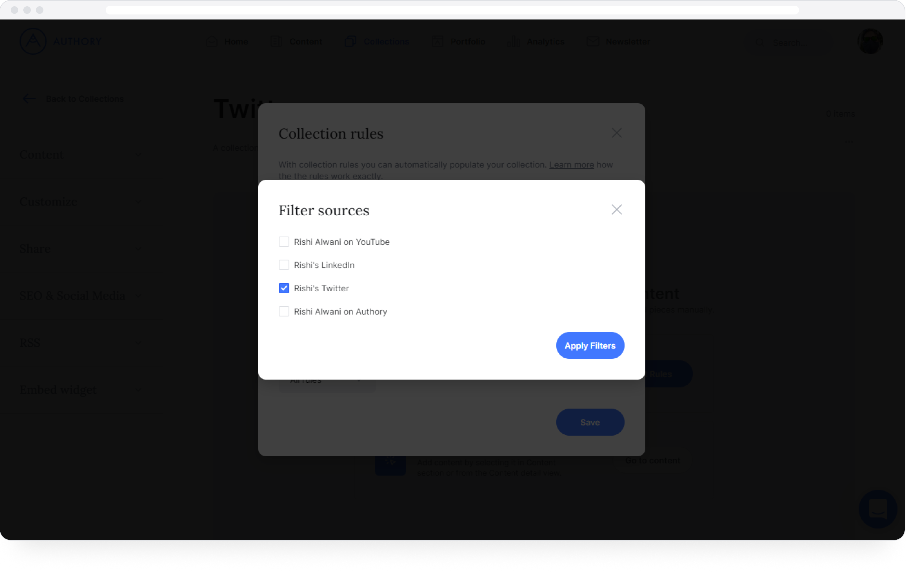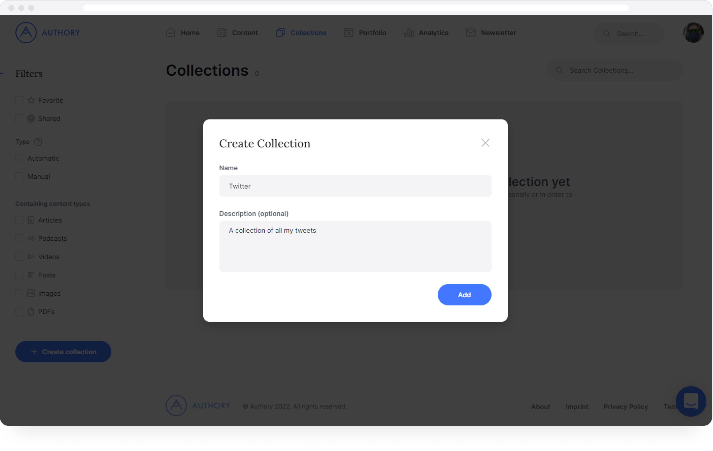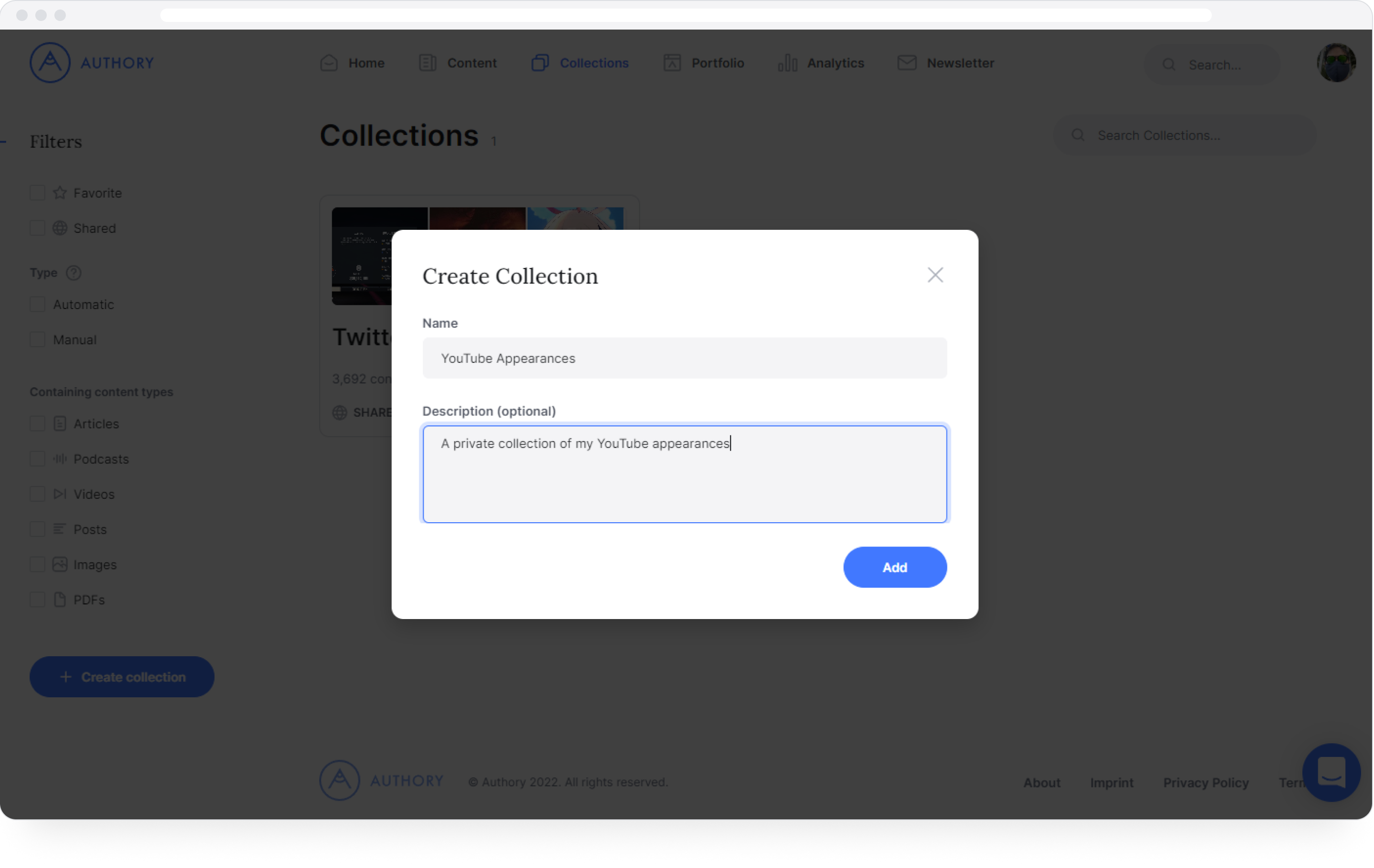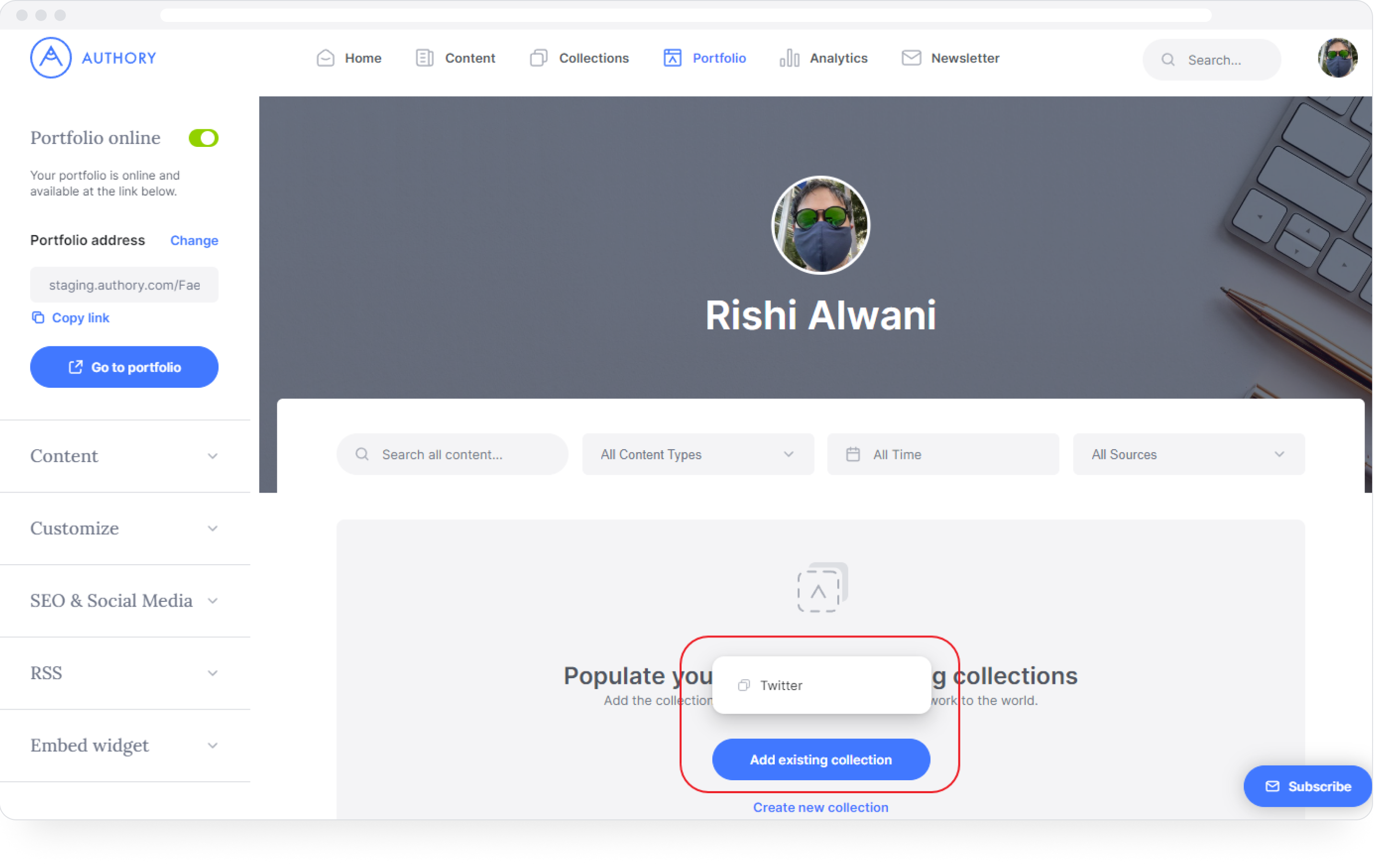 Navigate to the “Portfolio” tab at the top, and click on “Add existing collection”. We’ll choose the Twitter collection.