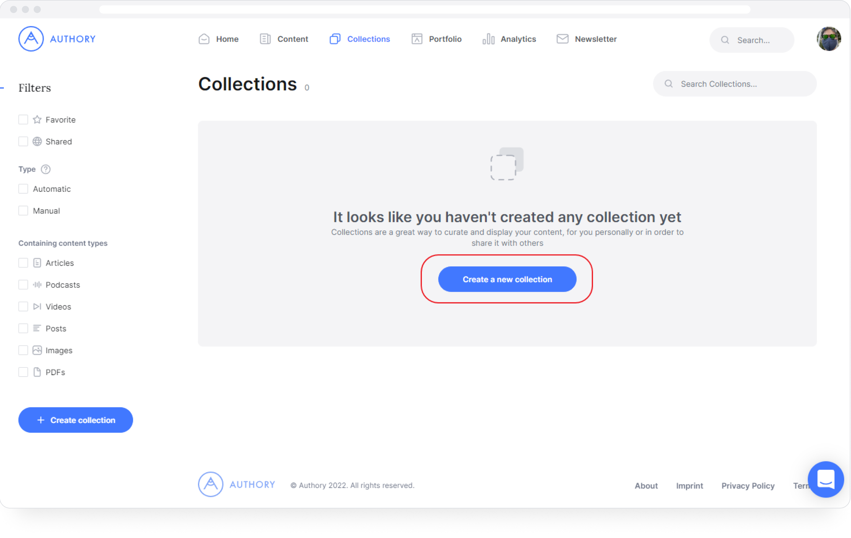 To do that, go to the “Collections” tab at the top. And click on “+ Create collection” as shown below.