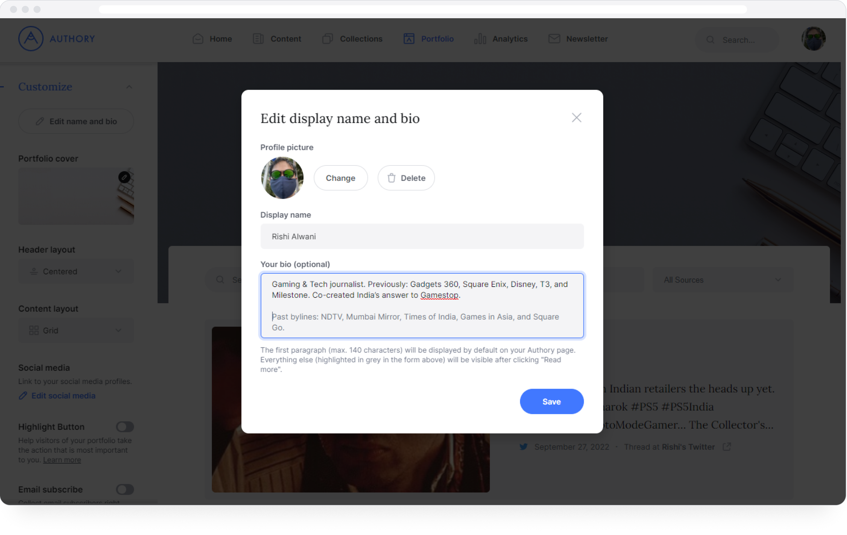 Now, we can customize the portfolio — edit the name and bio, change the portfolio cover, alter the header and content layouts, add social media links, highlight buttons, and more.