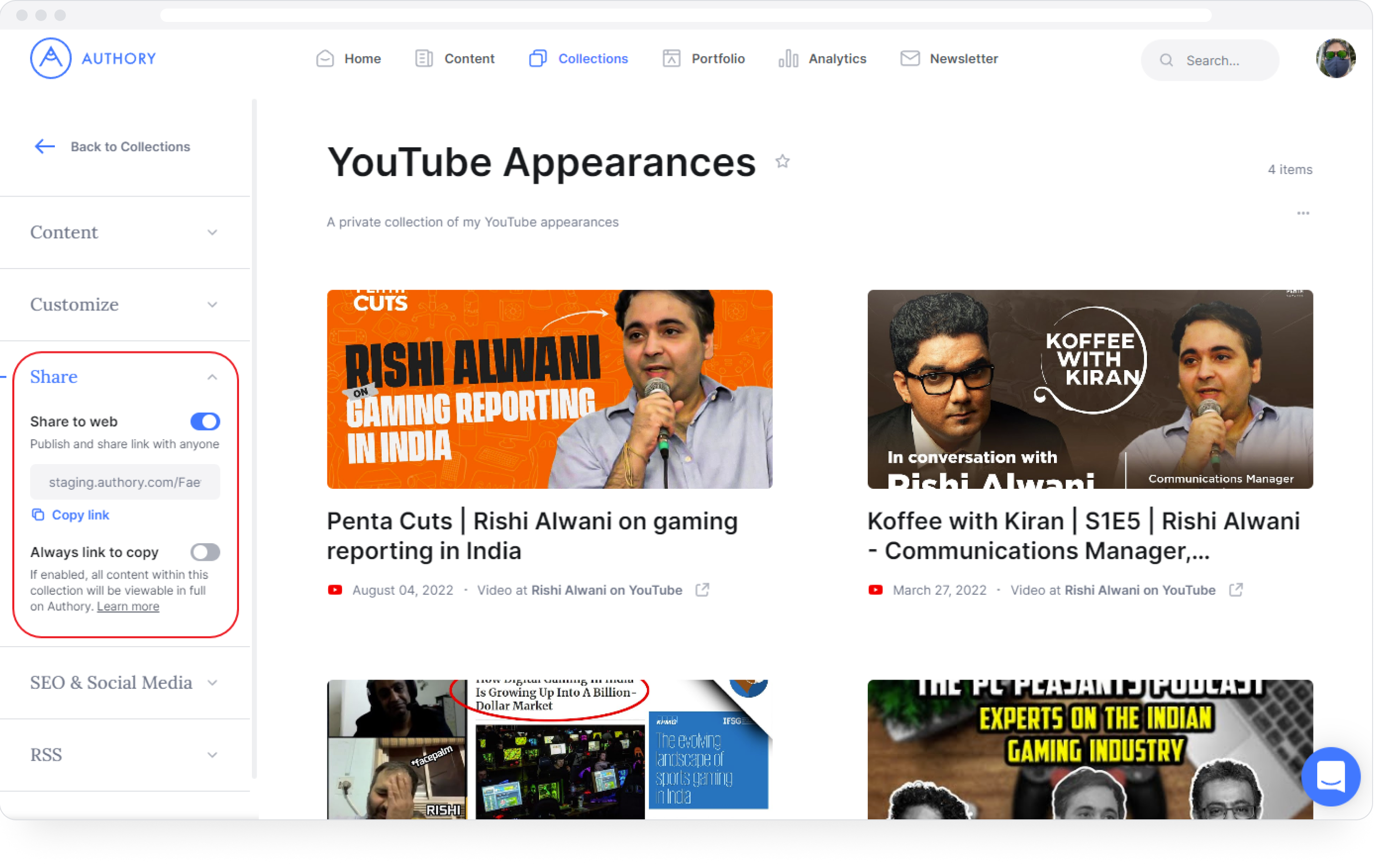 Use a portfolio website builder like Authory to create your portfolio. Add your sources, build collections, work on your about section, and beautify your portfolio. The collections can be for case studies, client testimonials, marketing wins, and more.