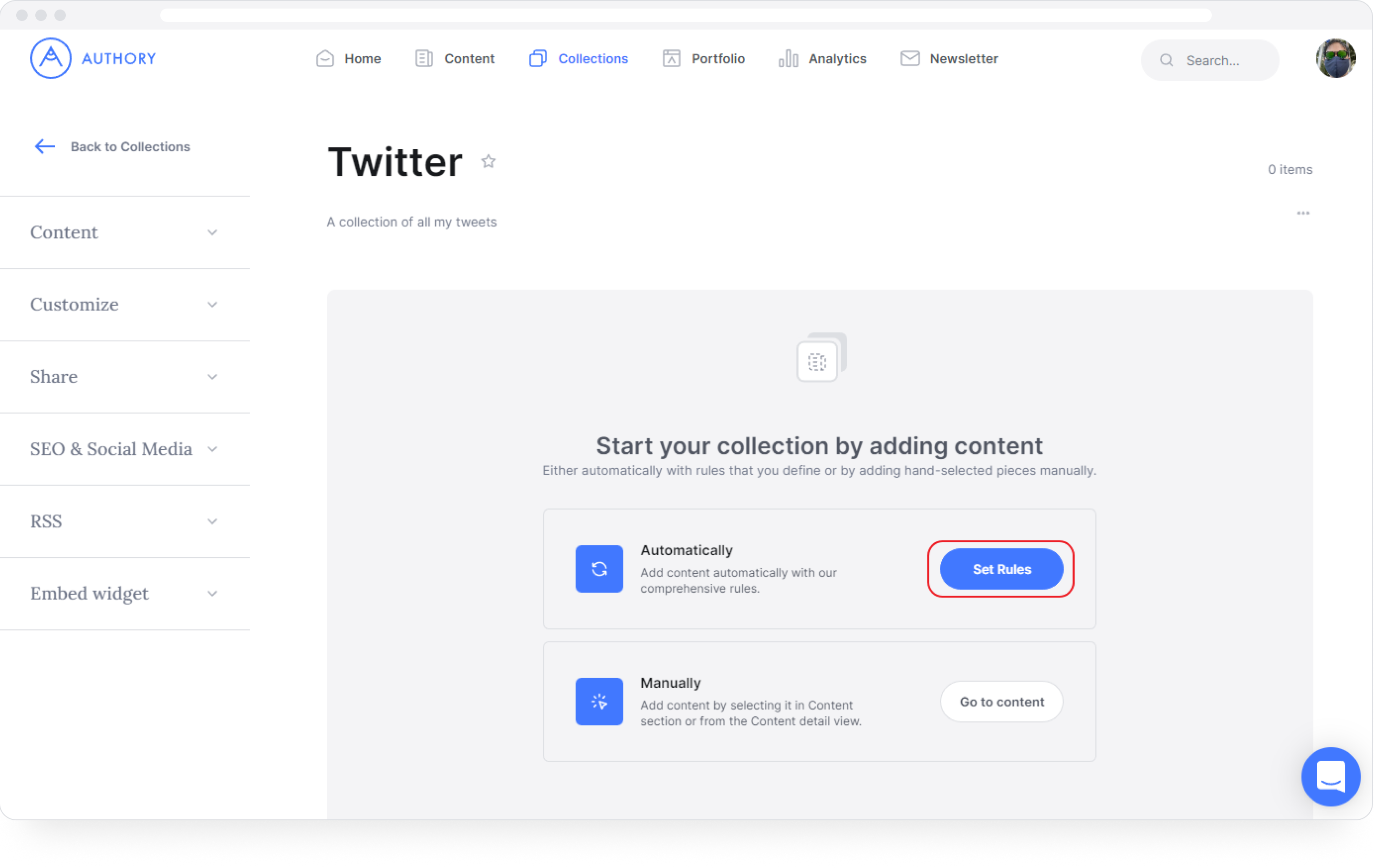 There are two methods to create a collection. Let’s choose the first — the “Set Rules” option.