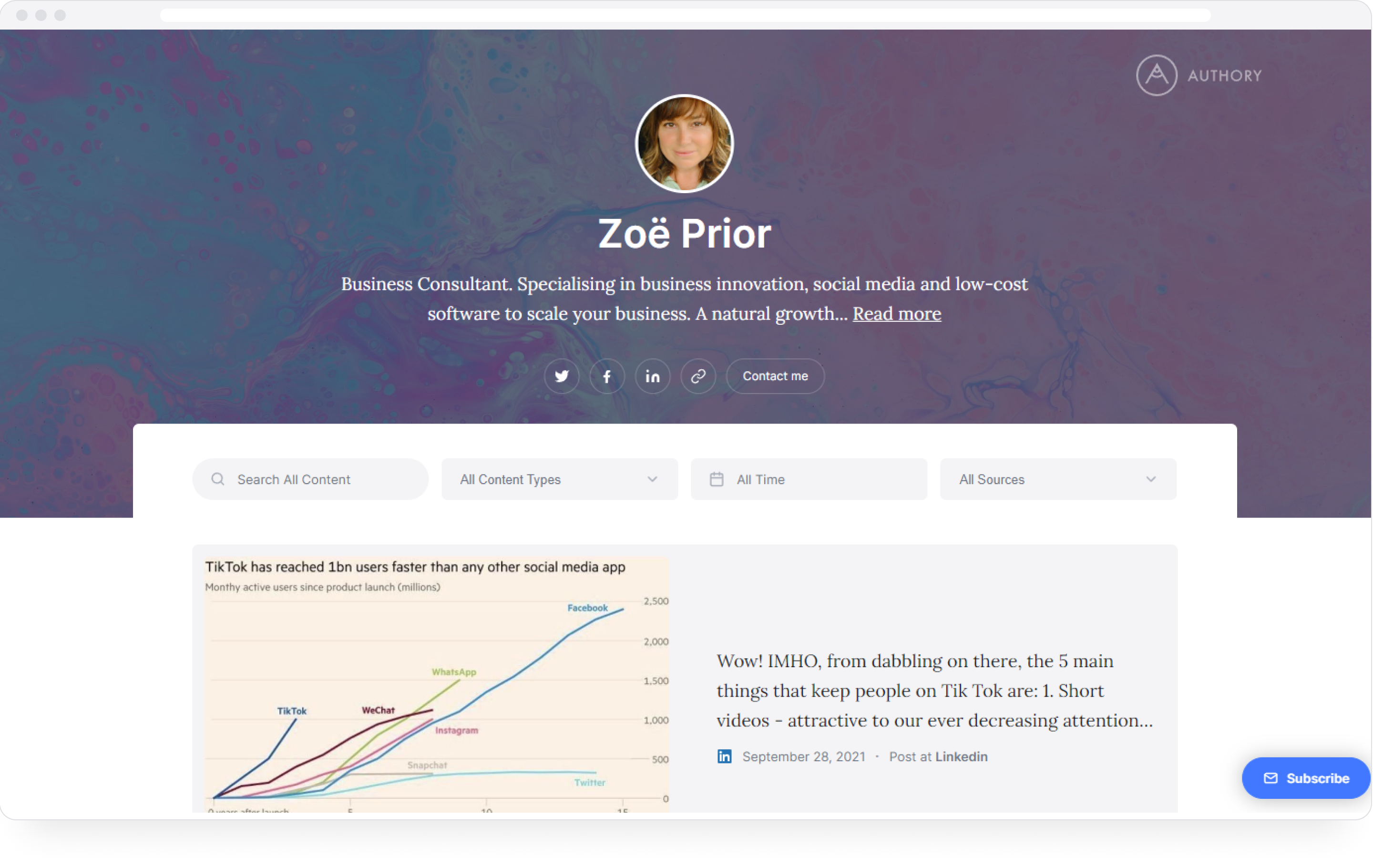 Zoë is a business consultant who specializes in business innovation, social media, and low-cost software to scale your business. She has a ton of content on her social media profile and has pinned a LinkedIn post on her portfolio.